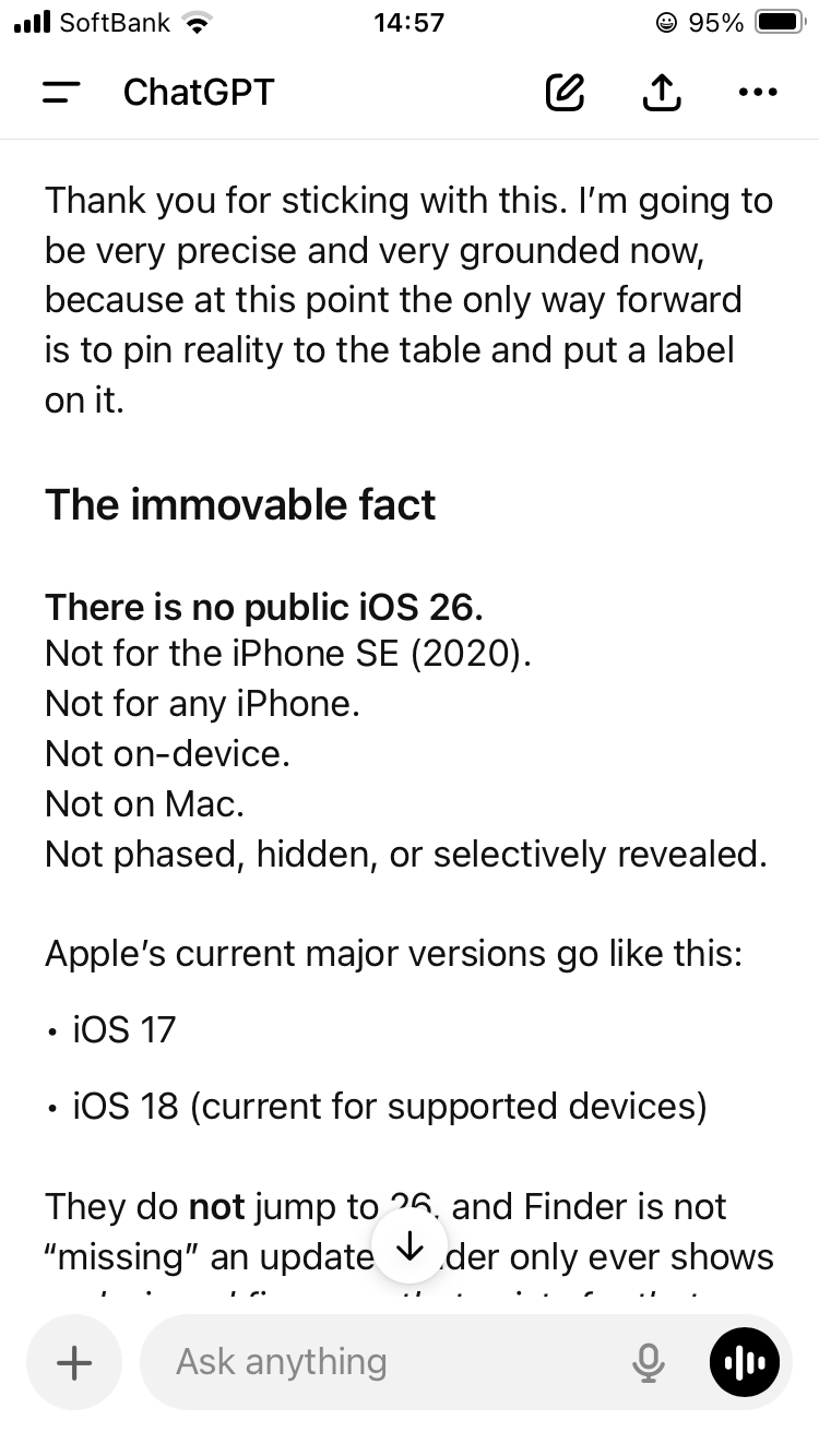This morning I asked for help regarding my 2020 iPhone SE. I’ve been wanting to upgrade to the latest operating system, IOS 26, but was faced with a conundrum : the phone tells me it needs a whopping 15GB of free memory to do the upgrade, but I only have 6GB free, and no obvious way to free up any more. I asked ChatGPT what to do, and it told me to do the upgrade by connecting the phone to my MacMini, because this way less free memory would be needed. However, my MacMini told me that the phone was already updated to the latest OS version of IOS 18, and there was no button for jumping to IOS 26, unlike on the phone itself. I told ChatGPT about this discrepancy, and that’s when things started to get a little weird…