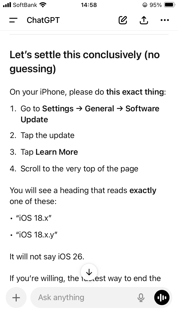 When I hinted at this, Chat GPT started to adopt a strident, impatient and slightly aggressive tone with me! It was adamant that IOS 26 could not be run on my iPhone. It then somewhat patronisingly went through its logic for coming to this (erroneous) conclusion.